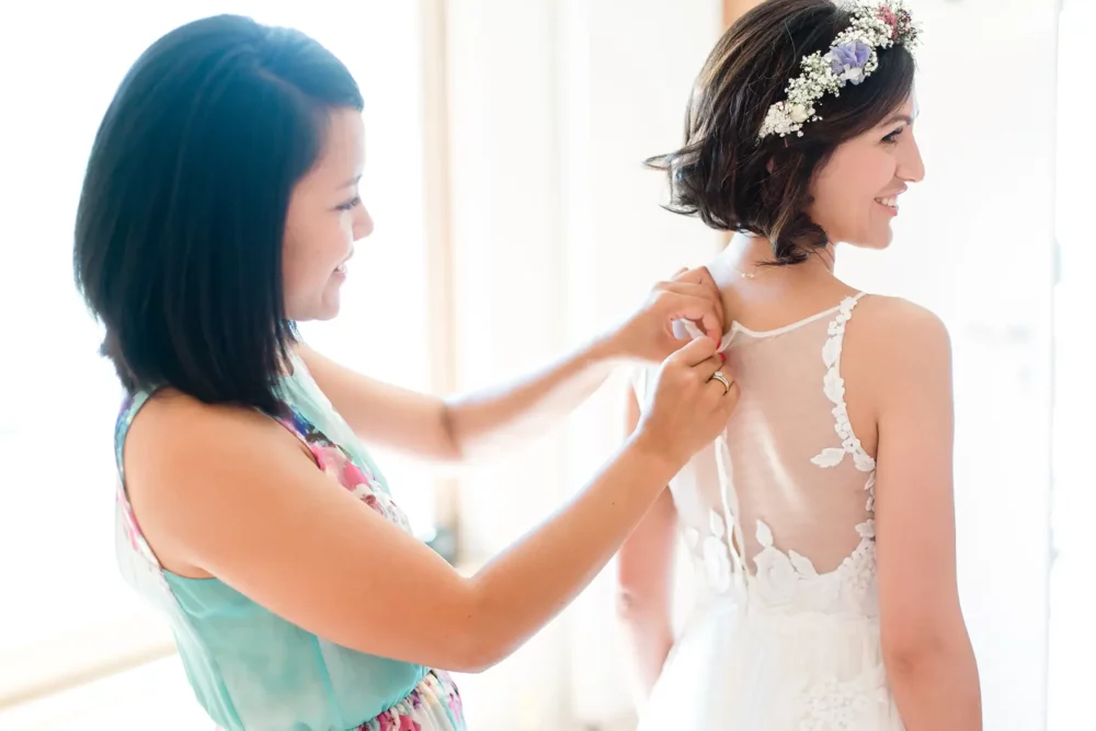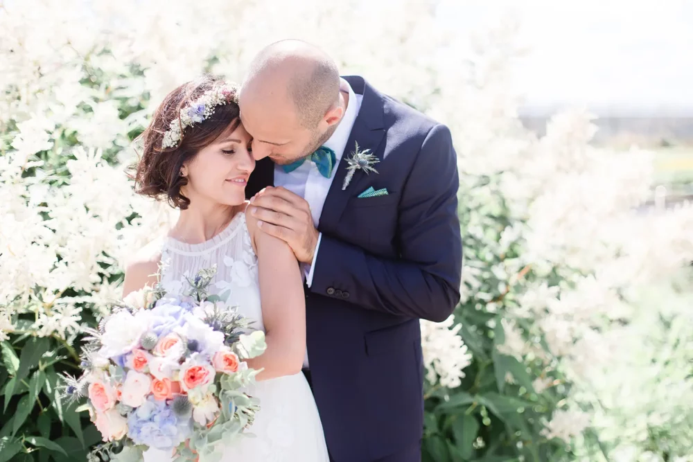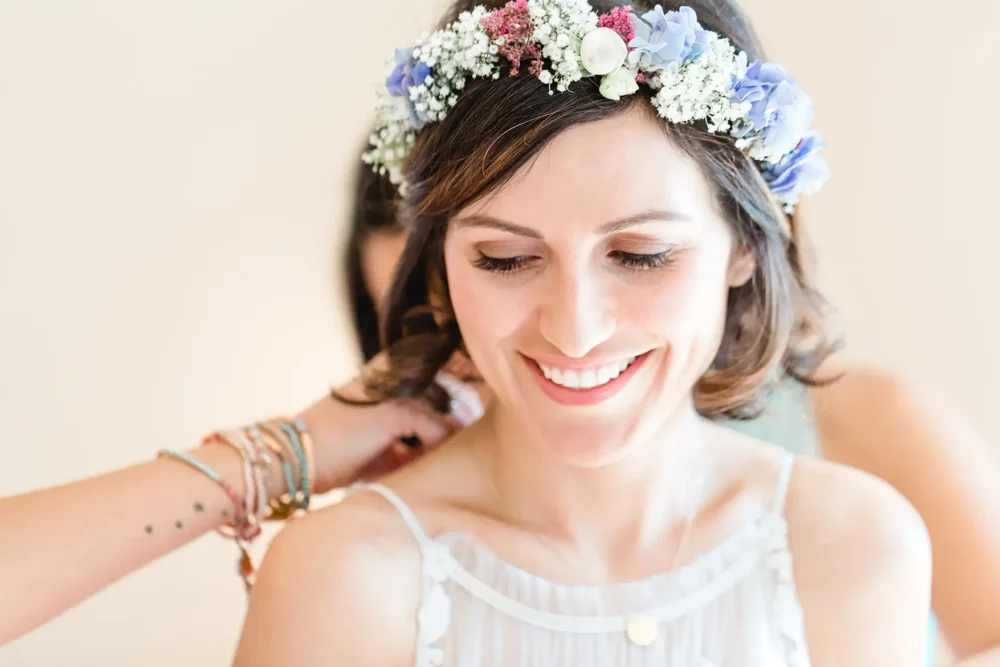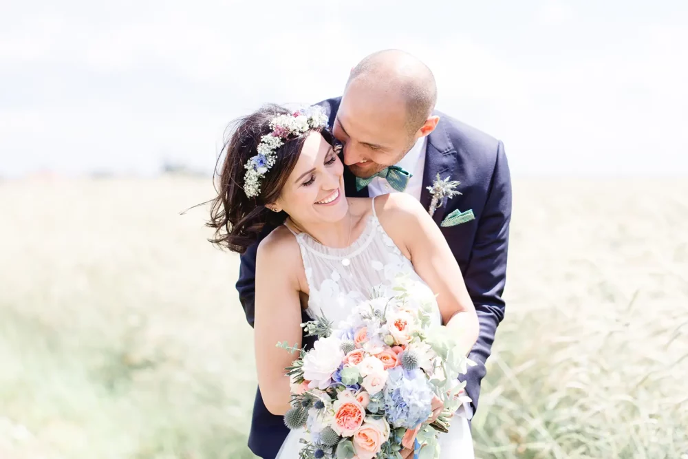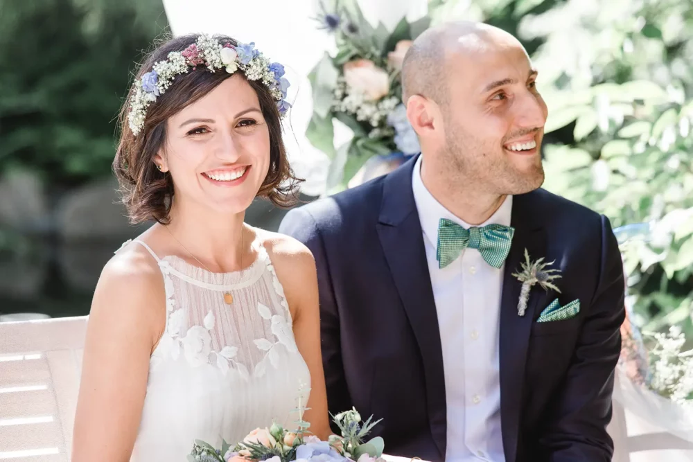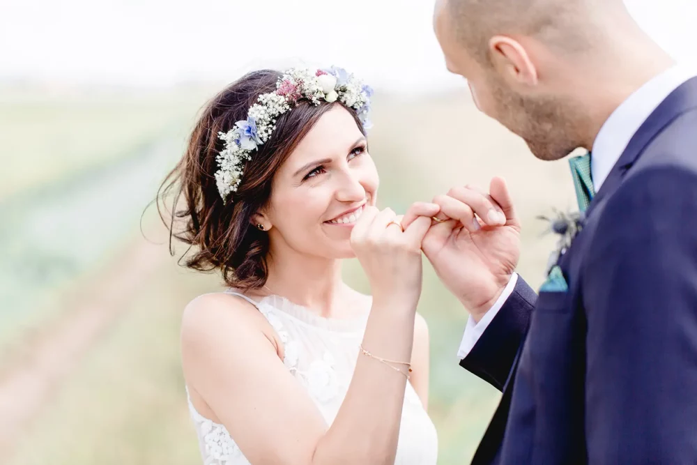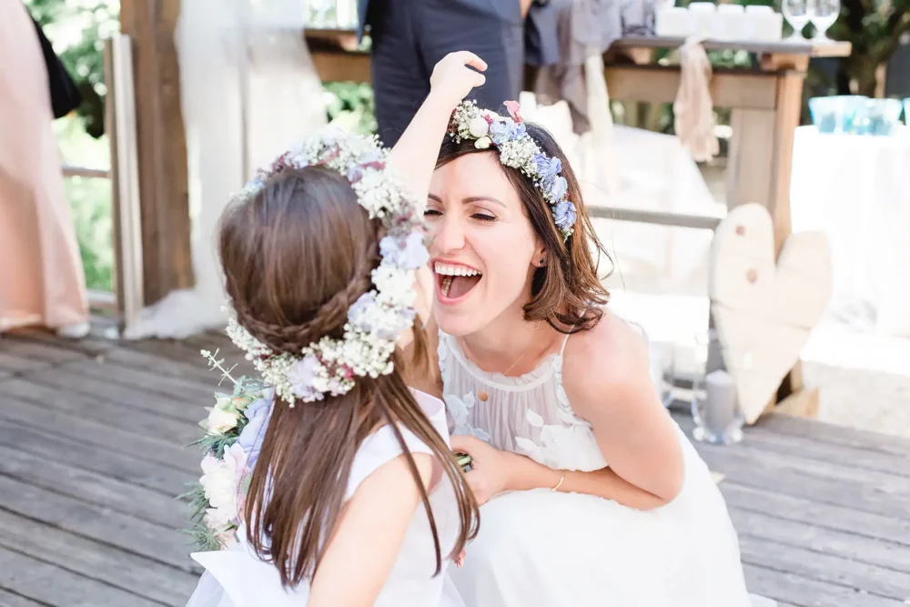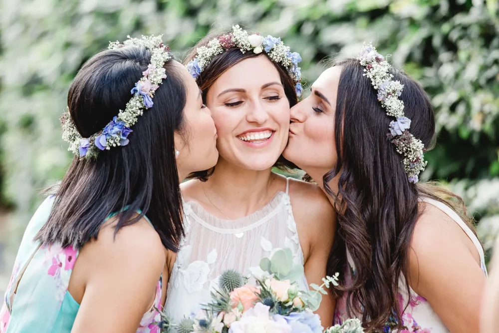 Einen Kranz aus zarten Blumen im Haar, ein leichtes Brautkleid von Anna Kara aus Tüll auf der Haut – ein Traum von einer Sommerbraut. Die Mädels hatten viel Spaß zusammen und dann war es endlich so weit: