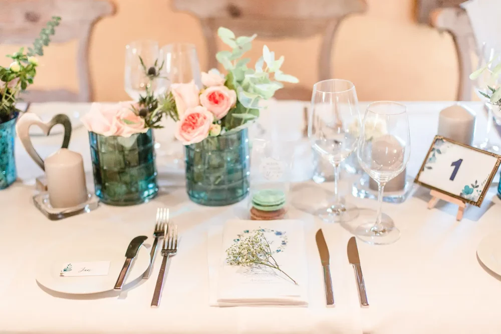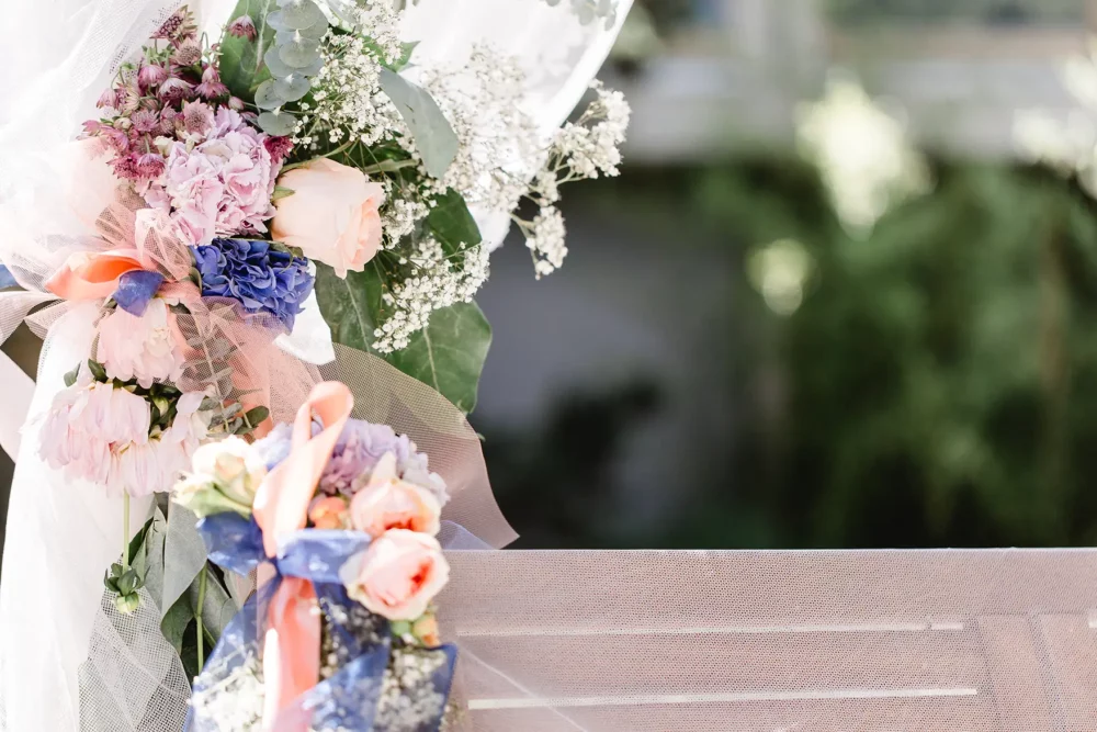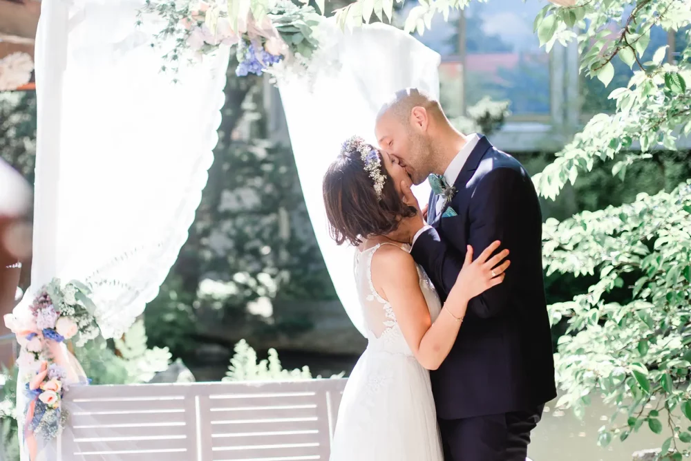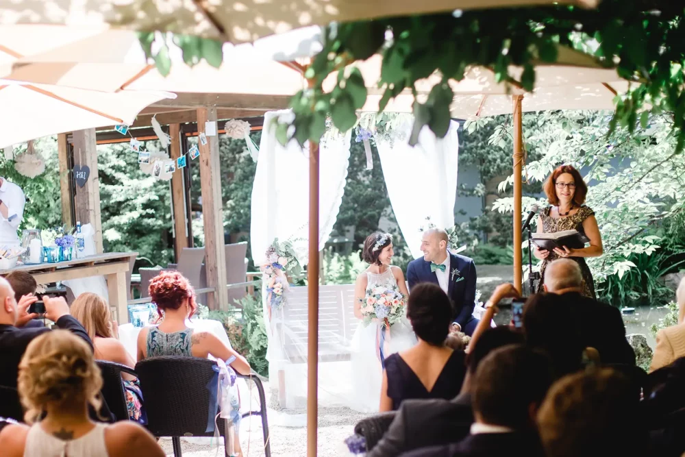 Nach dem Shooting sollte die Hochzeit im Freien starten. Zur freien Trauung im japanischen Garten des Schindlerhofs trafen sich die Gäste in einem Blumenmeer inmitten liebevoller Hochzeitsdeko. Ein bisschen rustikal, ein bisschen boho, oppulent und dennoch edel – die Atmosphäre dieser Hochzeit im Schindlerhof war beeindruckend.